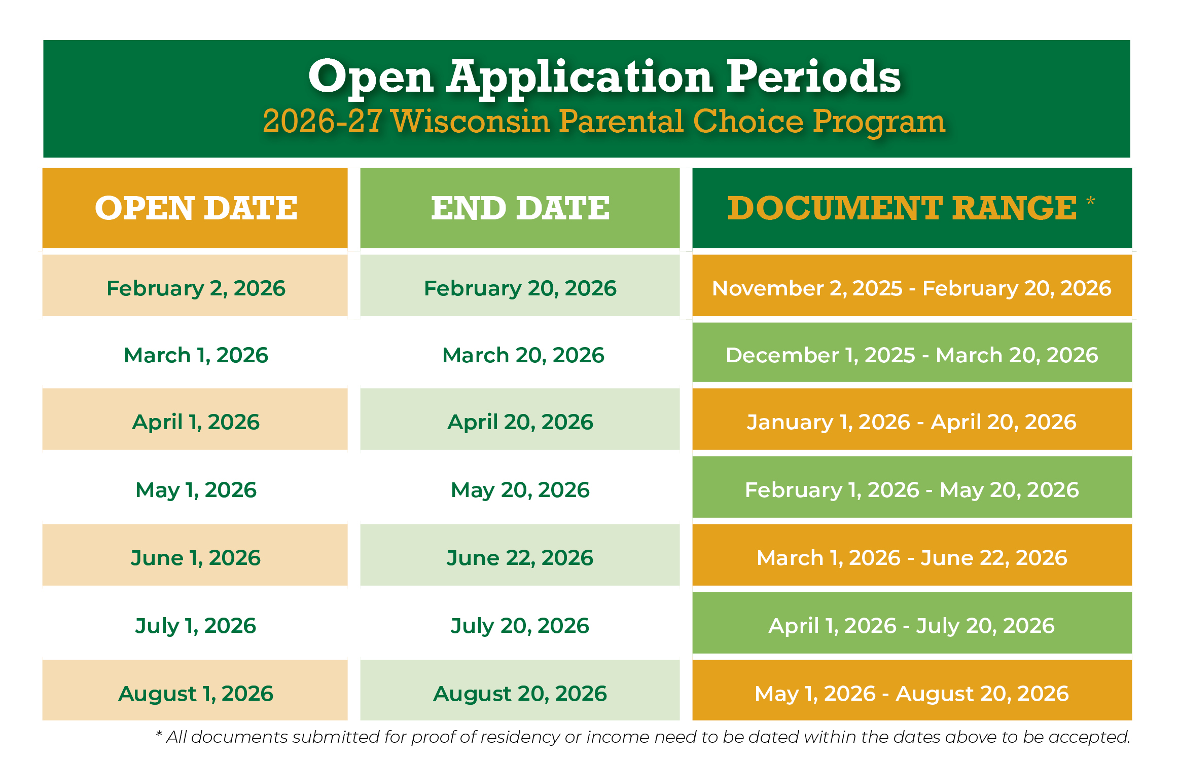 ONLY THE ABOVE LISTED DOCUMENTS ARE ACCEPTABLE. WE WILL NOT ACCEPT DOCUMENTS OUTSIDE OF THIS LIST. All residency documentation must be dated within three (3) months of when you submit your online application. (SEE CHART BELOW)