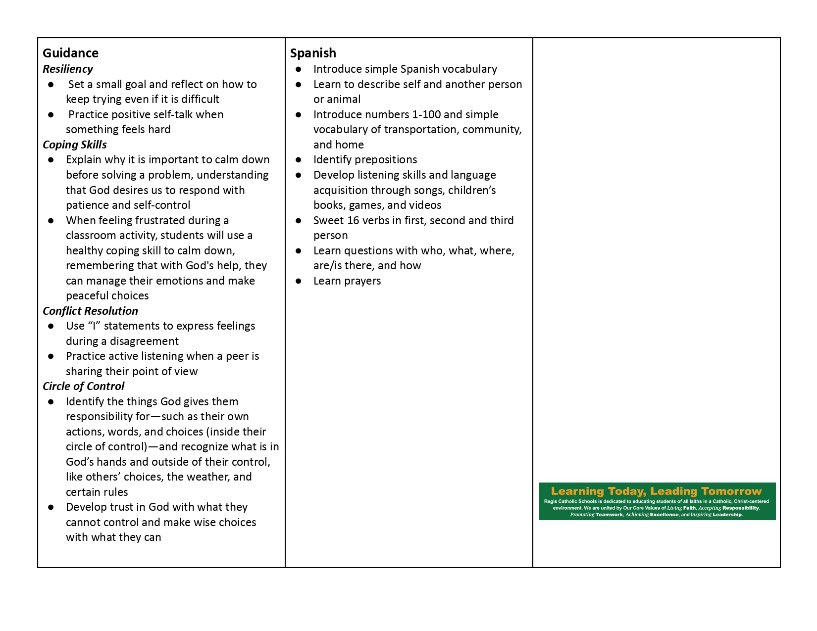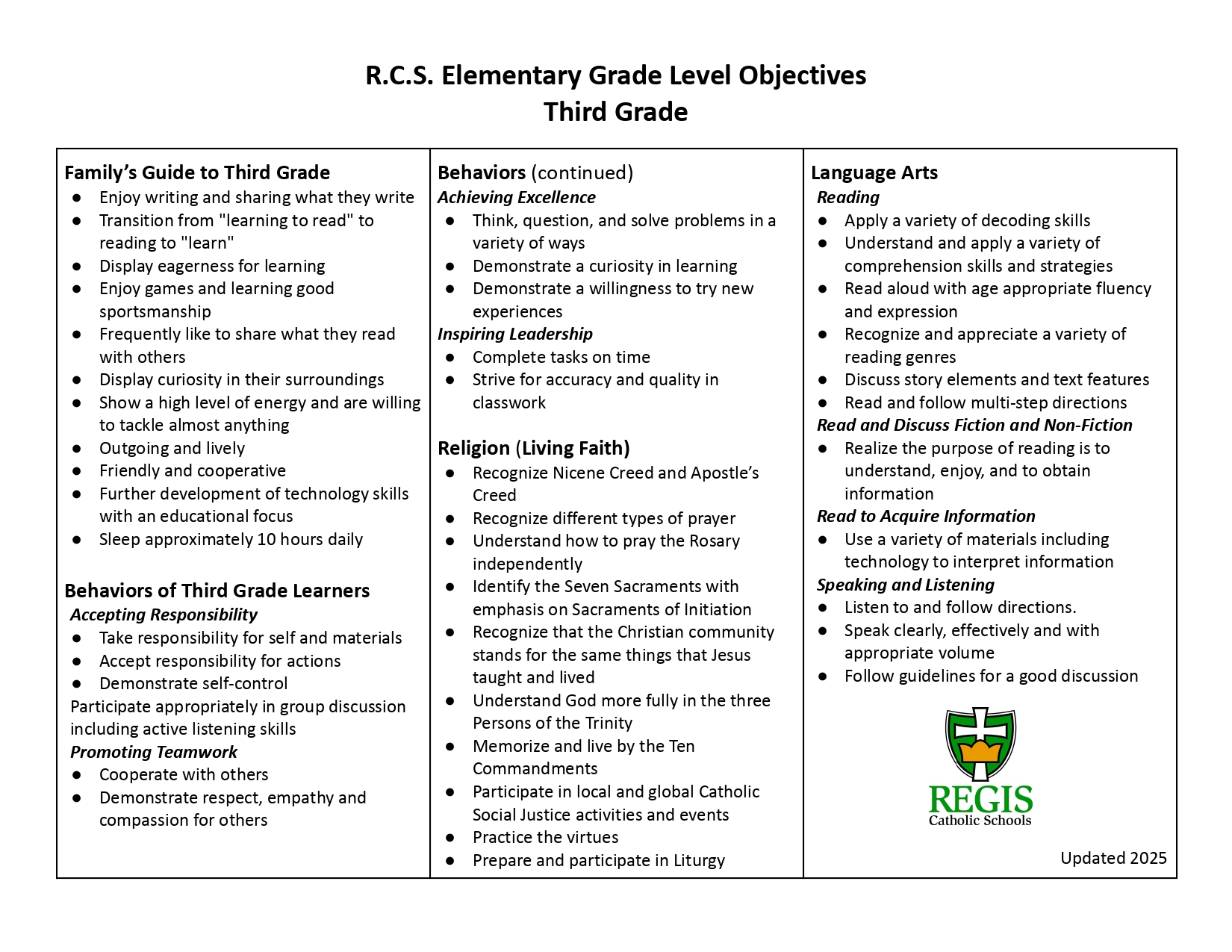 Regis Catholic Schools is dedicated to educating students of all faiths in a Catholic, Christ-centered environment. We are united by Our Core Values of Living Faith, Accepting Responsibility, Promoting Teamwork, Achieving Excellence, and Inspiring Leadership.