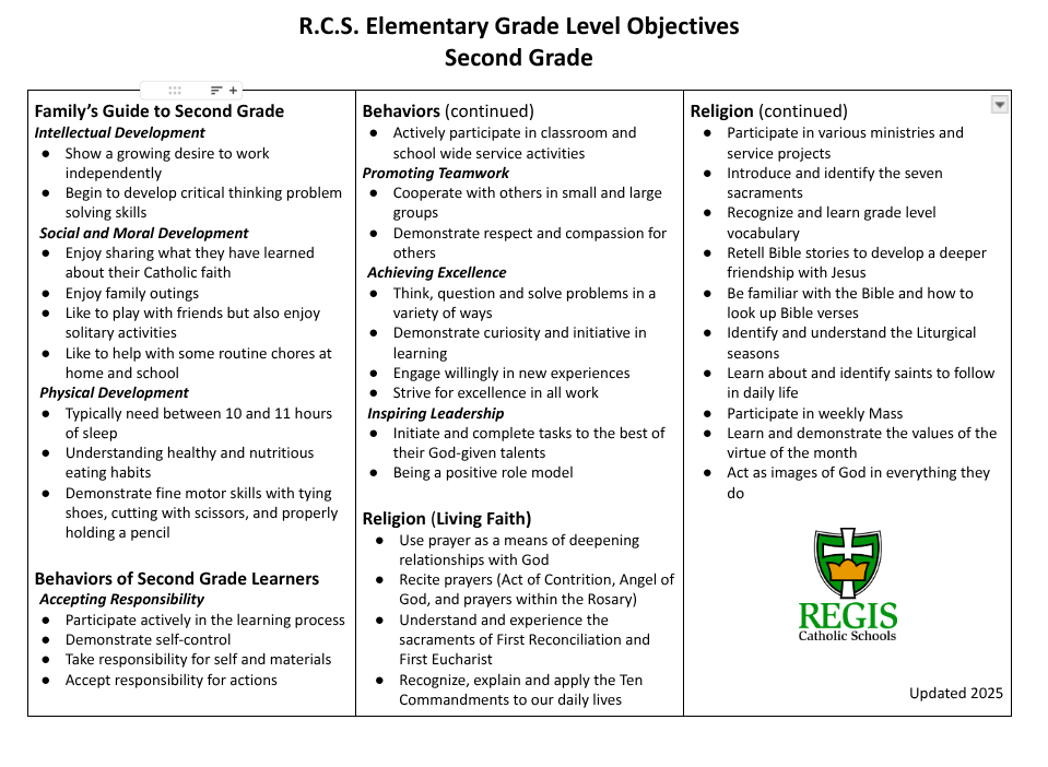Regis Catholic Schools is dedicated to educating students of all faiths in a Catholic, Christ-centered environment. We are united by Our Core Values of Living Faith, Accepting Responsibility, Promoting Teamwork, Achieving Excellence, and Inspiring Leadership.